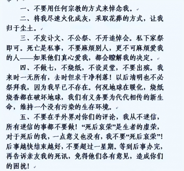 并且琼瑶在信中还表示,不要对自己进行任何方式的抢救,也不要在自己去世之后举办任何意义的追悼形式,甚至连讣告也不要发。