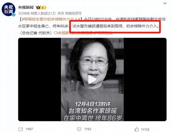 据台湾媒体报道,著名作家琼瑶女士于12月4日在家中轻生去世,享年86岁。