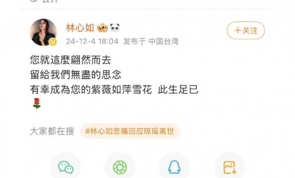 林心如在得知琼瑶去世之后,伤心的情绪无以言表。