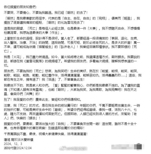 琼瑶害怕的也不是死亡,害怕的是没有尊严的活着,在信的最后,琼瑶再三叮嘱要求儿子儿媳执行她最后的权利,这对她来说很重要。