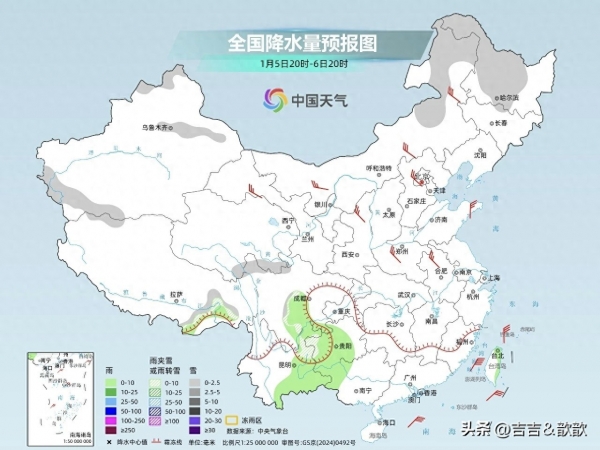 天气舞台今儿上演"冰火两重天"!1月5日,新疆、内蒙古等地还有小雪"散装"派送,重庆、安徽、浙江等地则有小雨签收。但重点来了:今晚起,全国大部雨雪快递将提前收工,切换为"晴多雨少"模式!