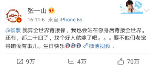 杨紫过生日的时候,他说就算全世界背叛你,我也会站在你身后背叛全世界,真是想泪目。