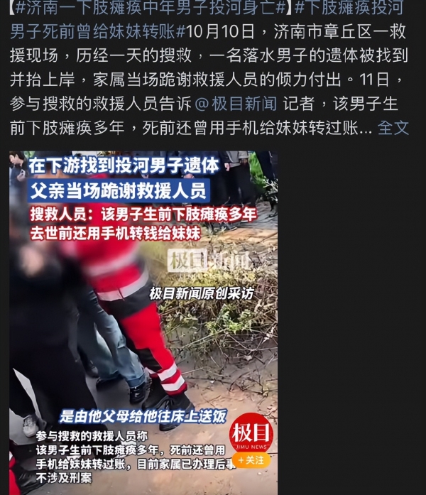 时间往前倒回,2025年10月9号的早上,他那个瘫痪多年的儿子,趁着家里人不注意,自己一个人,默默地开着那辆小小的电动三轮车,就出门了。他不是去兜风,他也不是去散心,他是去赴一场早就计划好的死亡。到了河边,他没急着下去,先把手机里所有的钱,一分不剩,都转给了他妹妹,然后把手机、银行卡,还有所有的身份证明,都整整齐齐地放在了车里,车门都没关。这是他留给这个世界最后的体面,也是给家里人最后的交代。