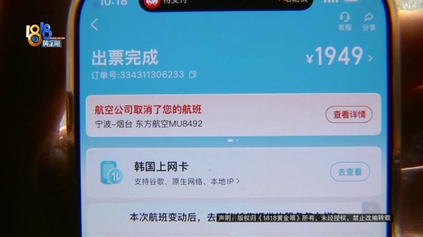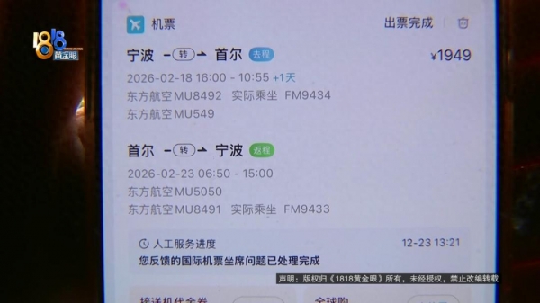 周女士提供了购票信息,宁波往返首尔的机票一共1949元,下单时间是2025年12月18号上午9点。