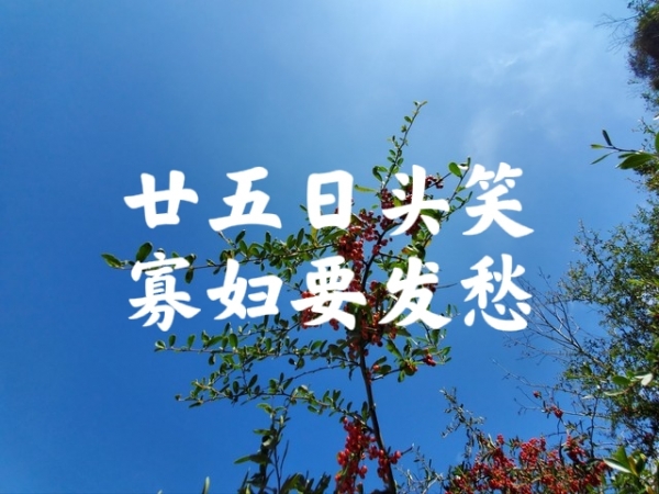 明白上面的内容,我们再来"廿五日头笑,寡妇要发愁" 这句老话就非常容易理解了,意思是说,如果农历九月二十五这天阳光明媚,是个大晴天的话,那么可能预示当年的冬天不仅少雨雪,还可能是个暖冬。这样一来,对于失去家里主要劳动力的寡妇人家来说,可就要发愁了!