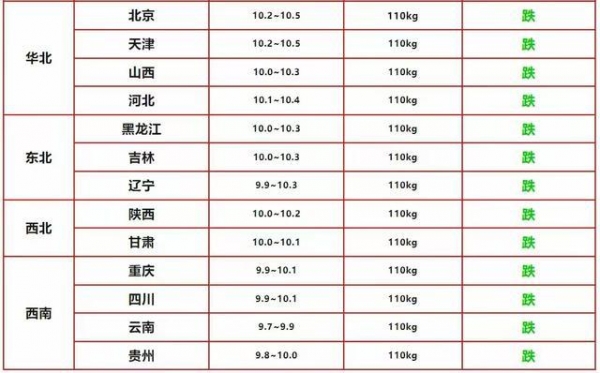 辽宁下跌0.3元,参考价9.9-10.3元/斤。