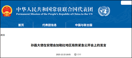 中国常驻联合国代表团网站消息,当地时间12月23日下午,联合国安理会应委内瑞拉请求,在中国、俄罗斯等国支持下召开紧急会议。中国常驻联合国副代表孙磊大使在会上发言表示,美国持续加强在加勒比海及委内瑞拉周边的军事部署,并不断升级制裁、封锁与武力威胁,甚至妄言霸占委方领土与资源。美方此类行径公然践踏他国主权安全,严重违反《联合国宪章》及国际法,对地区和平构成了现实威胁。全文如下: