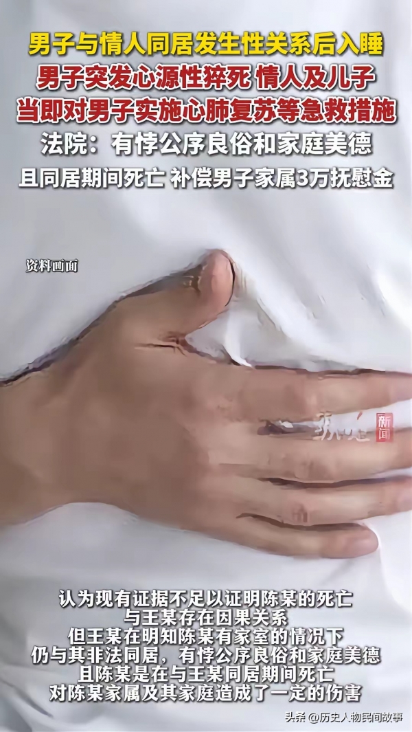 安徽安庆一起因婚外情引发的猝死索赔案,近日随着法院一审判决尘埃落定,引发社会广泛讨论。已婚男子陈某与情人王某发生关系后同居期间突发心源性猝死,陈某妻子以王某需承担30%责任为由,索赔丧葬费、死亡赔偿金等共计37万余元,最终法院的判决超出多数人预期。