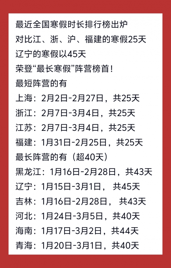 目前全国多数地区都已经公布了寒假的时间安排,而辽宁不出所料地荣登"最长寒假阵营"榜首,辽宁省的寒假是从1月15日开始的,一直持续到3月1日,共计45天,是寒假最长的省份。
