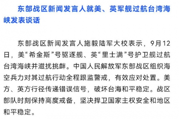 9月16日,东部战区披露,12日时美国的"希金斯"号驱逐舰,和英国的"里士满"号护卫舰一同穿越台湾海峡,并且对我方展开挑衅。而我方则组织舰机,对其进行全程跟踪警戒。当时我们都以为,这不过是台海上一场平常的较量,然而最近,英国知名媒体《泰晤士报》采访了"里士满"号护卫舰上的船员,才让我们深切的感受到,中国人民解放军维护领土主权完整的决心之坚决、手段之强硬。