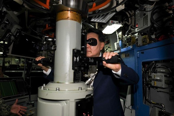 2023年7月19日,在釜山市南区的海军作战司令部基地,时任韩国总统的尹锡悦登上美军俄亥俄级"肯塔基"号战略核潜艇;但如今他已……图源:美国海军