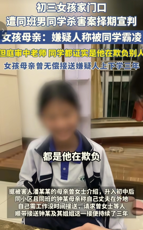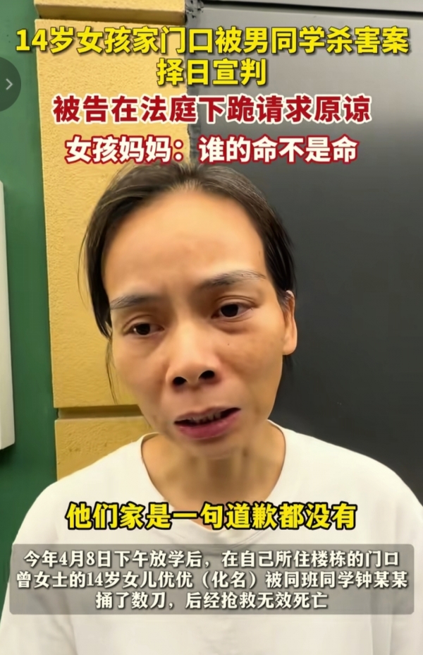 这件事情的起因是2025年4月8日有一名叫优优的初三女生,在自家门口被同班的男生钟某持刀给杀害了,这个男同学的作案动机只是因为生活琐事对优优心生不满,案件进行了开庭审理但是要择期宣判。