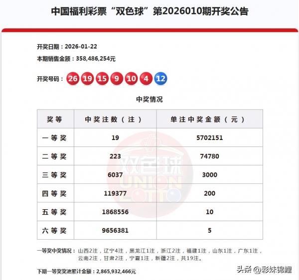今天1月22日,星期4,晚上双色球26010期开奖出炉了。