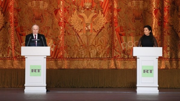 俄罗斯总统普京在"今日俄罗斯"电视台成立20周年庆典晚会现场,右侧为"今日俄罗斯"主编玛格丽塔·西蒙尼扬