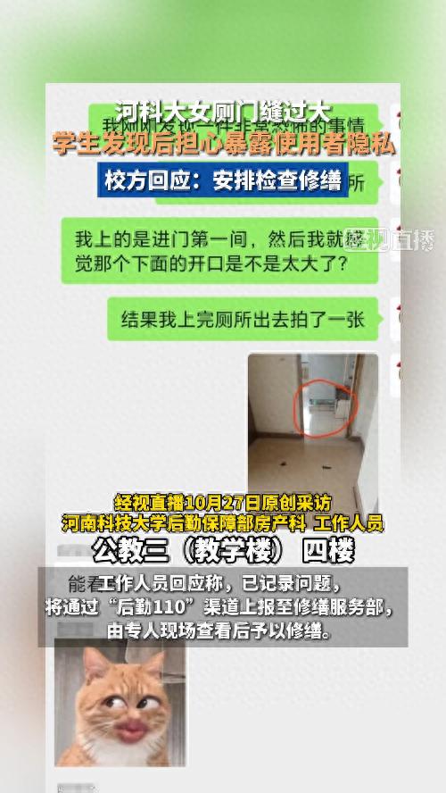 经视直播记者致电河南科技大学后勤保障部房产科,工作人员回应称,已记录"公教3教学楼4楼女厕门底缝隙过大"的问题,将通过"后勤110"渠道上报至修缮服务部,由专人现场查看后予以修缮。