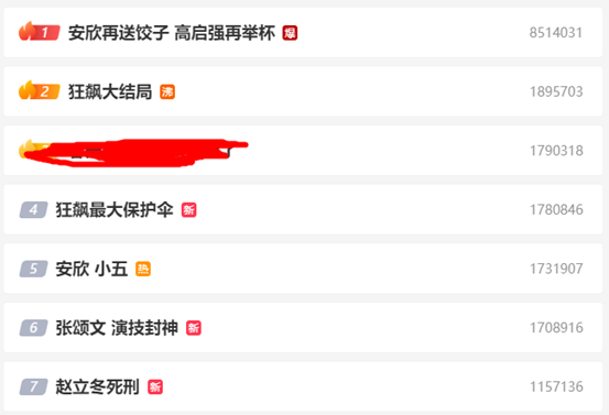 随着大结局的到来,《狂飙》直接"霸榜"2月1日晚间的微博热搜,排名前10的热搜中,有6个与《狂飙》相关。