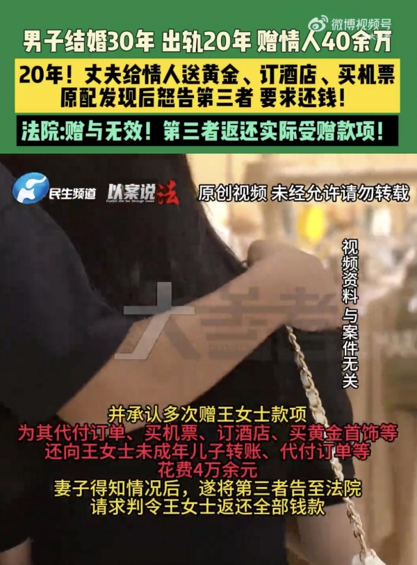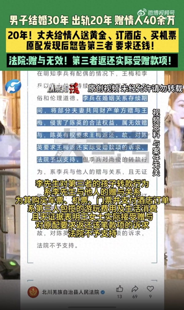 最近,四川绵阳一起原配起诉第三者的案件引发全网热议。陈某与丈夫李某结婚30年,偶然发现丈夫竟与王某保持了长达20年的婚外情关系,期间向对方转账40余万元!更让人震惊的是,法院判决支持原配追回全部赠与款项,其中涉及的一些细节,值得所有已婚人士深思。