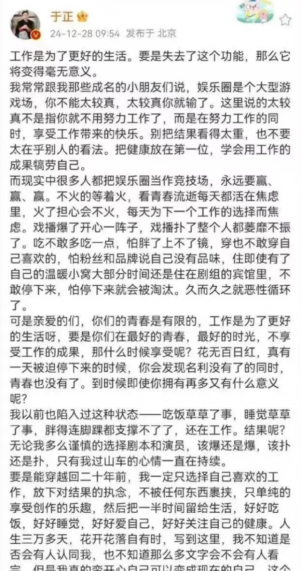 于正:娱乐圈很多人把工作当作生活的全部。