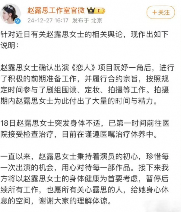 接着,赵露思的老东家也出来发文辟谣,宣告赵露思身体抱恙,暂全面停掉工作,好好休息养病。