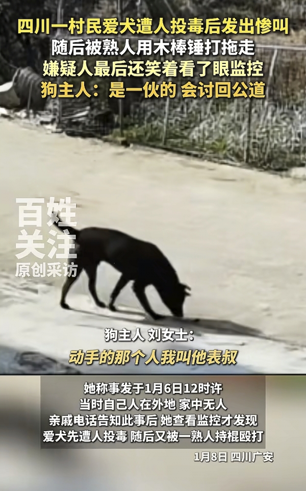 1月8日,四川广安的刘女士向媒体反映,自己养了一年多,40斤重的中华田园犬黑儿,被人投毒后又用粗棍打晕后强行拖走。