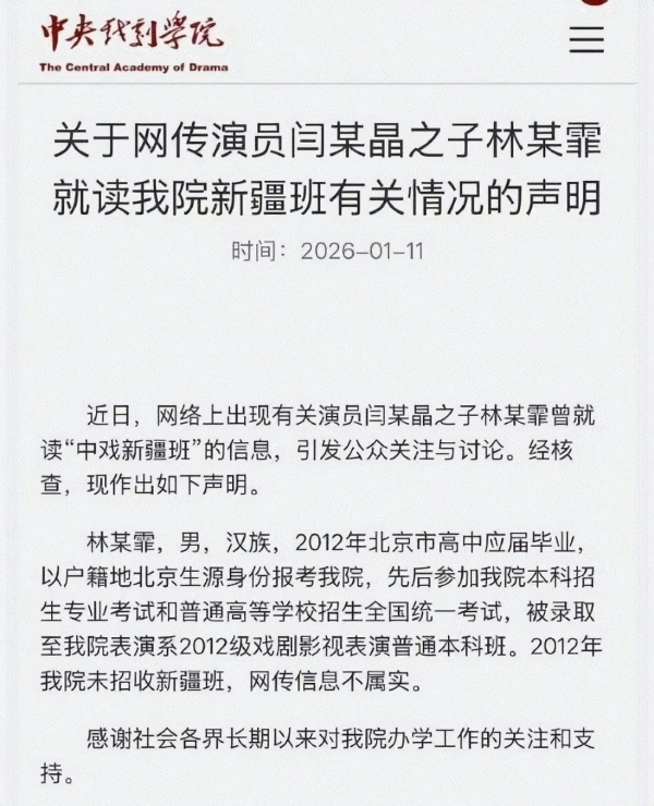 中央戏剧学院针对闫学晶儿子读"新疆班"舆论事件给出回应,称林某霏不是新疆班毕业的