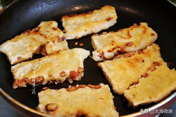 平底锅刷底油,码入切好的年糕片,小火慢煎,翻面煎至表面金黄。
