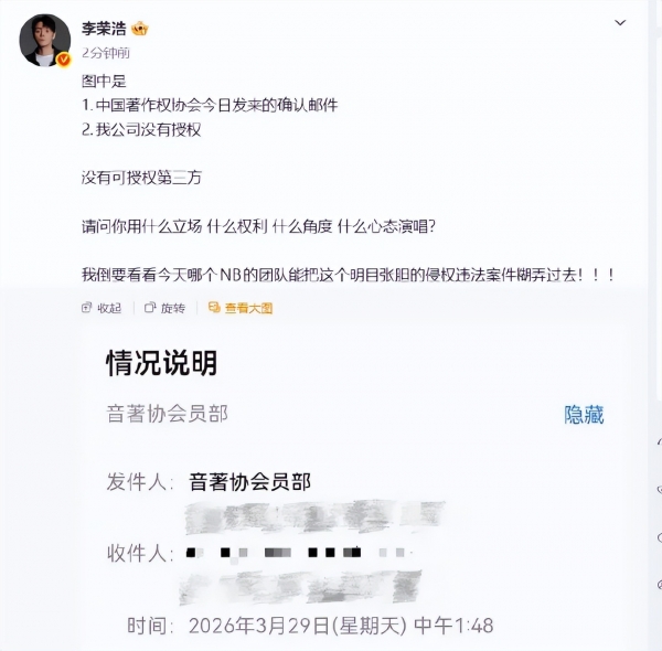 这个回应显然让李荣浩不满。李荣浩再次在微博发声,并放出中国著作权协会发来的"情况说明"截图,图片中,中国音乐著作权协会明确提到,"协会未就该作品(《李白》)发放任何授权。"