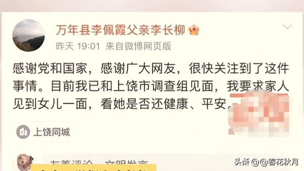 7月26日晚上19点01分,李长柳发表了动态,从时间上看,这是李长柳将举报材料交给市委联合调查组之后发布的,李长柳主要是感谢国家和感谢网友,并且要求家人与女儿见面,看看女儿是否还健在。