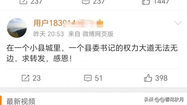 这里要插播一条信息。在7月25日晚上的8点53分,李佩霞的老父亲李长柳发了一条耐人寻味的动态,他在动态中说:"在一个小县城里,县委的权力大到无法无边。"
