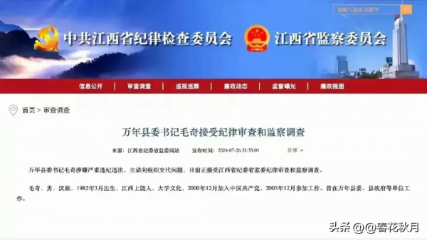 眼看事情越闹越大,省纪委不得不出面了,7月26日晚间时候,江西省纪委发出通报,万年县委书记毛奇涉嫌严重违纪违法,主动向组织交代问题,目前正在接受江西省纪委审查。
