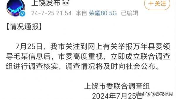 举报事情迅速引爆网络,7月25日的晚上9点54分,江西上饶市委高度重视,上饶市迅速成立联合调查组,调查情况,并及时向社会公布。