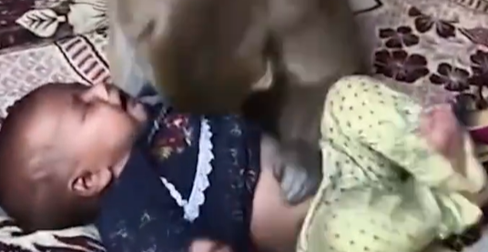 事情发生在印度北方邦,有一只猴子突然闯进了一户人家,劫持了一名3个月大的婴儿。它没有伤害这个婴儿,而是轻轻地抚摸这个婴儿,陪着婴儿玩耍,而当其他人想去救下这个婴儿时,这只猴子就会攻击其他人,不让其他人救走婴儿。最后,有人用手机吸引了这只猴子的注意力,才成功将孩子救了下来。
