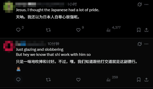 评论区,不少网友对高市早苗这种谄媚的姿态感到疑惑,"还以为日本人自尊心很强呢"。
