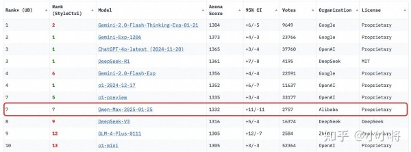 在Chatbot Arena LLM Leaderboard榜单中,Qwen2.5-Max以1332分位列全球第七名,超越DeepSeek V3、o1-mini和Claude-3.5-Sonnet等模型。Qwen2.5-Max的各项指标都略高于DeepSeek和LLaMA模型。