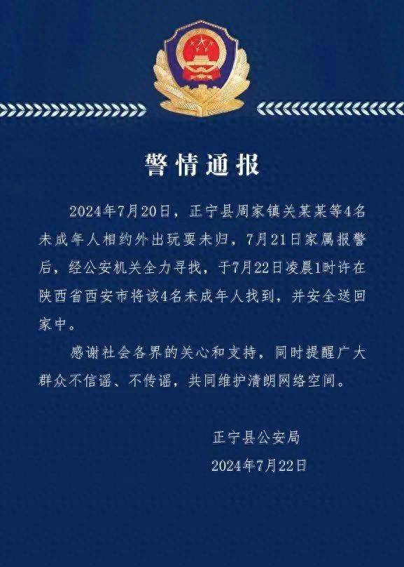 此前,2024年7月22日,甘肃省正宁县公安局对外通报了一起未成年人失踪事件。7月20日,正宁县周家镇的关某某等4名未成年人在相约外出玩耍后未能按时归家,引起了家属的担忧。7月21日,焦急的家属向公安机关报案。