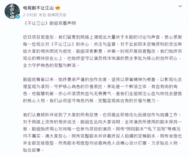 ▲▼《不让江山》剧组发声。 (图/翻摄自微博/电视剧不让江山)