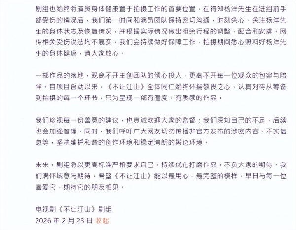 《不让江山》剧组表示,作品落地离不开观众的包容,全体同仁皆怀揣敬畏之心对待每个环节,致力呈现有温度的作品,「我们深知自己的不足,后续也会加强管理。同时,我们呼吁广大网友切勿传播非官方发布的涉密内容、不实资讯等,坚决维护和谐的创作环境和稳定清朗的舆论环境。」