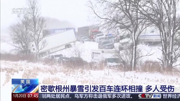 1月20日消息,据央视报道,当地时间 1 月 19 日上午,美国密歇根州西部遭遇强烈暴雪天气,恶劣路况引发交通事故。