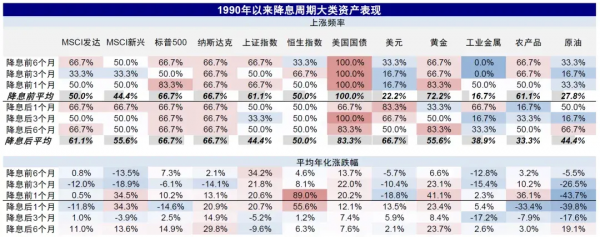 从不同资产的表现来看,黄金在整个降息周期中表现较好且更持续。并且越接近降息,黄金表现越好,在降息前1个月黄金平均上涨频率达72%,平均年化涨幅超40%。