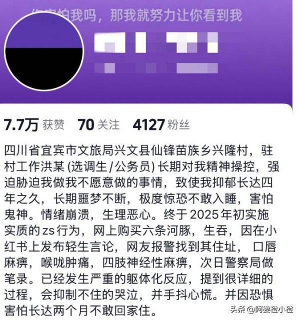她直接点名控诉继父--也就是面筋哥去世后,母亲再婚的对象--对自己实施长期进行精神操控。