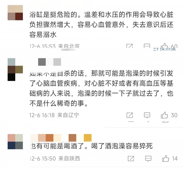 也有人猜测可能是因为冬天室内室外温差大所以导致心肌梗塞或脑中风,最终引发溺亡。
