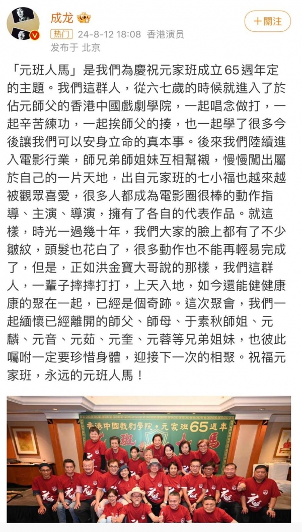 成龙发文庆祝"元家班"成立65周年,几十年过去,他们的情谊丝毫未减。