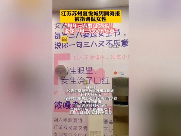 江苏苏州复悦城男厕海报被指调侃女性:"每年三八要过女王节,说你一句三八又不乐意"。
