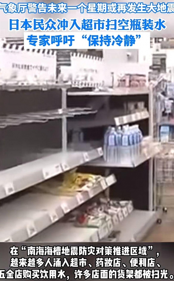 尤其是在南海海槽防灾对策推进区域,越来越多的人涌入超市、药妆店、便利店购买各类必需品,即食食品、固定家具的撑杆和卡式炉成为热卖商品,商品货架被扫光清空,电商平台也因为抢购而一度瘫痪!