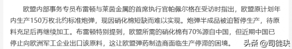 欧盟内部事务专员雷顿与莱茵金属的首席执行官,帕佩尔格在接受采访的时候指出,欧盟原计划半年生产的150万枚北约标准炮弹,现在因为硝化棉的短缺进而难以实现,并且布雷顿特别提到,欧盟所需的硝化棉其中有70%都来自中国,但由于中国已经停止向欧盟军工企业出口该原料,这让欧盟弹药制造商面临生产停滞的困境。