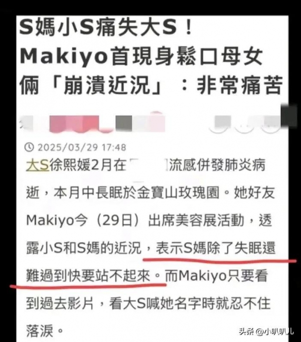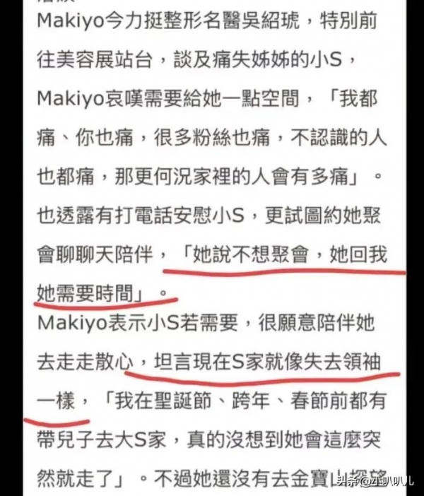 再说小S,makiyo也曾打电话给小S。她想要约小S出来,聚聚餐,然后陪小S聊聊天,这样会不会缓解小S的痛?而小S则回答,她不想聚会,没心情聚会,还需要时间来治愈。makiyo还坦言,失去大S的S家,就像失去了领袖。