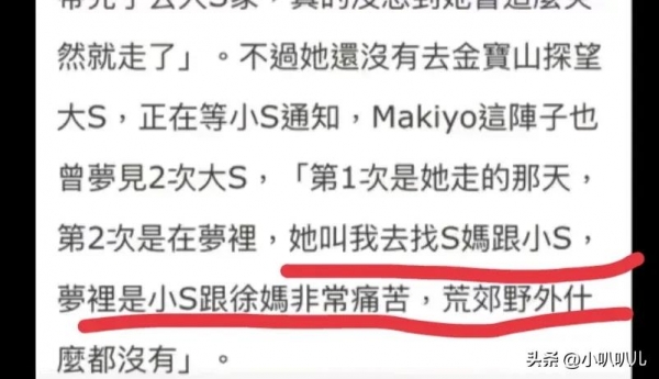 而且makiyo还说梦到大S。确实,大S离世之后,小S和S妈都无法走出来,还需要时间来治愈。而葛思齐的爆料,让汪小菲的口碑反转。汪小菲五月份又将如期举行婚礼,反观S家这边,具俊晔正在忙于设计雕像,房子也将法拍,小S难走出失去姐姐的痛苦,无法复工。而代替小S主持节目的吴珊儒却传来好消息。