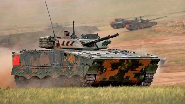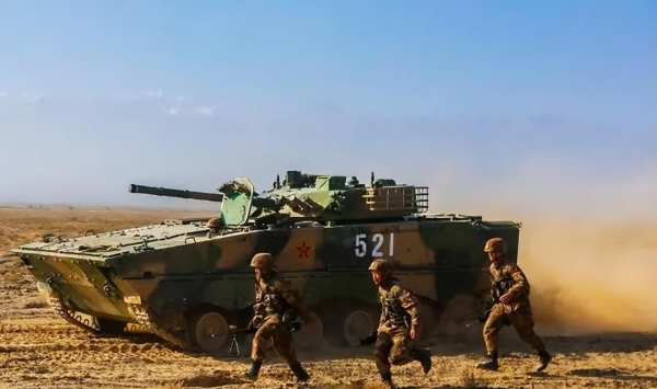 除了坦克外,重型合成旅还有600多辆装甲步兵战车,这些步兵战车主要的功能是搭载步兵进行突击。目前最多的是04A式步兵战车,这款履带式战车可以运送一个班的战斗人员。在它的顶部还有一门100毫米自动装填的线膛炮,外加30毫米的高射炮,高射炮可以打步兵、打轻型装甲,还可以打直升机和小型无人机,战场生存能力很强,是主战坦克的最好搭档。