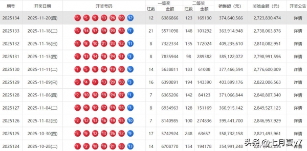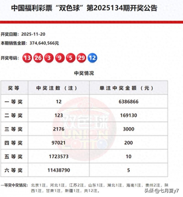 2025年11月20日,中国福利彩票双色球第2025134期开奖。本期全国投注总额达到3.74亿元,开出一等奖12注,单注奖金638万余元。