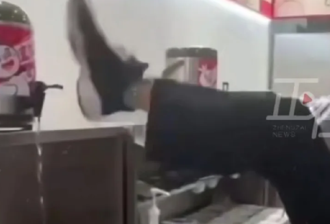 操作台上,直饮水桶稳稳地放置着,上面的 "直饮水" 标识十分醒目,它本应是干净、卫生的象征,为顾客提供安全放心的水源 。然而,接下来发生的一幕却让人大跌眼镜。身着蜜雪冰城员工制服的男子,脚上穿着的鞋子显然是在店内忙碌一天后沾满灰尘的,他毫无顾忌地抬起脚,朝着直饮水桶的水龙头踢去。每一次踢踹,水桶都微微晃动,水龙头与桶身碰撞发出的声音,仿佛是在敲击着消费者对食品安全信任的底线。